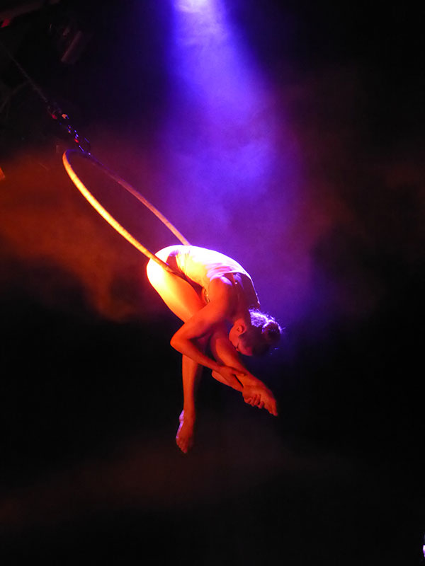 A breathtakingly beautiful Performance. Artists are suspended in the air from a spinning hoop whilst performing flexible, elegant and dynamic moves.