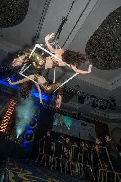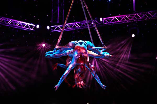 The only aerial pyramid to be performed in the UK. This exciting unique act is a captivating and powerful performance, perfectly illustrating the collaboration between the duo. A fast spinning flexible performance which can be enjoyed from all angles.